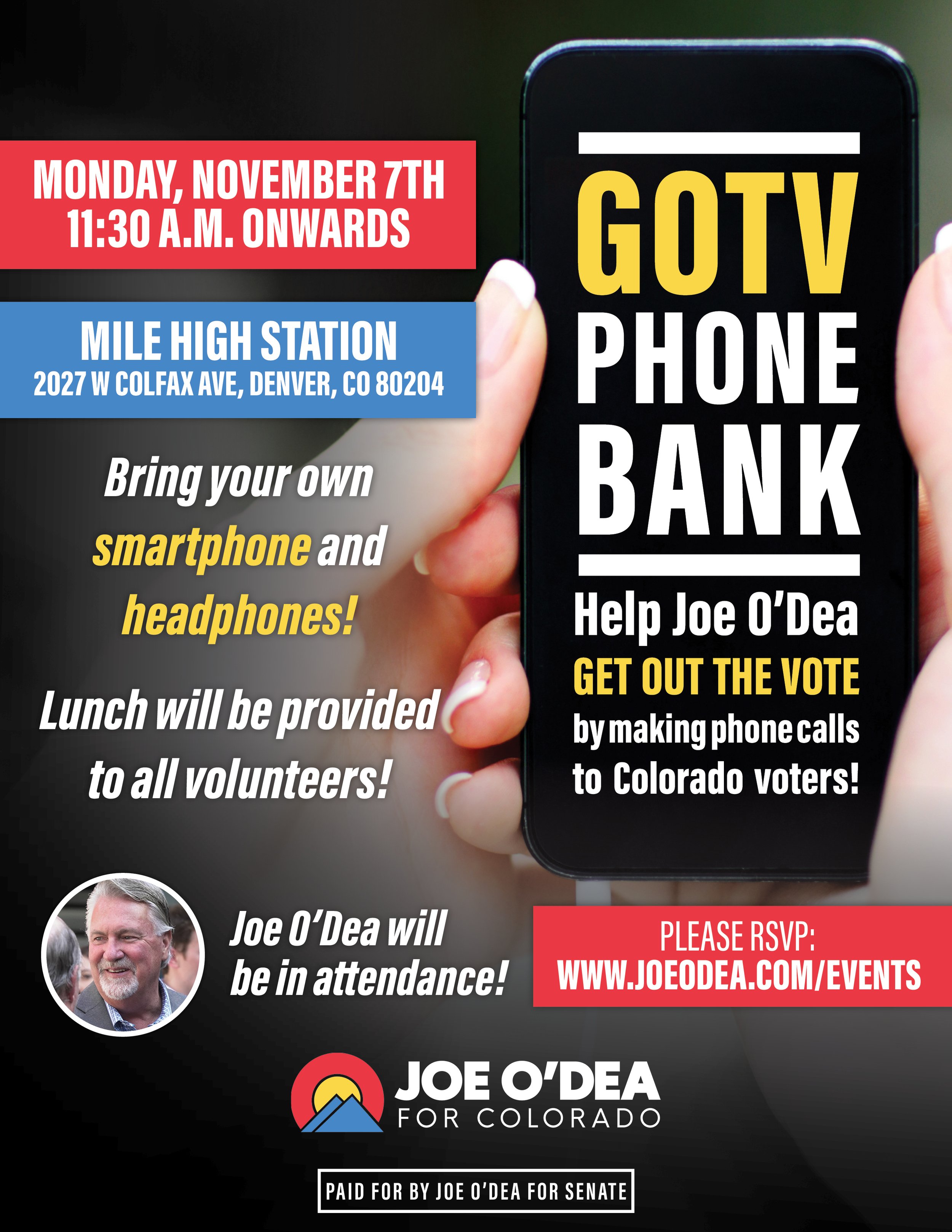 Come join Joe O’Dea and make the final push to get out the vote! Staff will provide training to help you call voters to encourage them to vote by November 8th! Please bring your own smartphone and headphones!