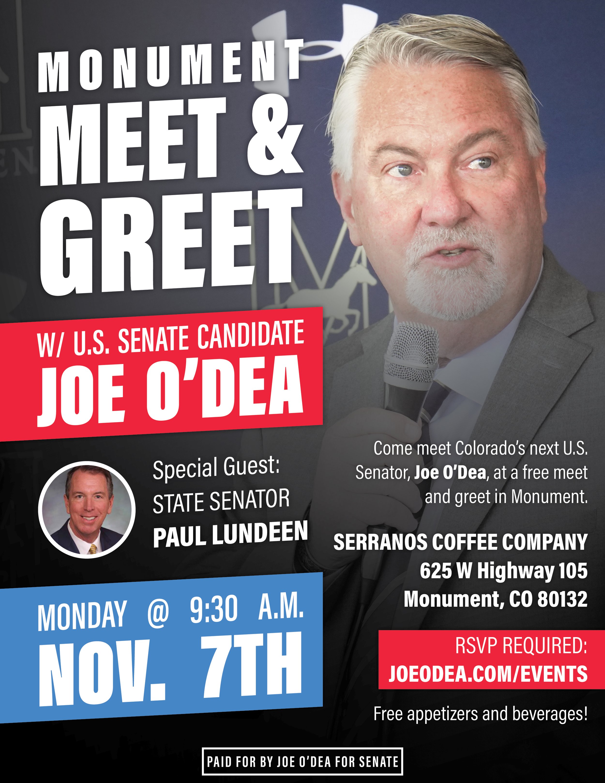 Come meet Colorado’s next U.S. Senator, Joe O’Dea, at a free meet and greet in Monument. Special guest: State Senator Paul Lundeen.