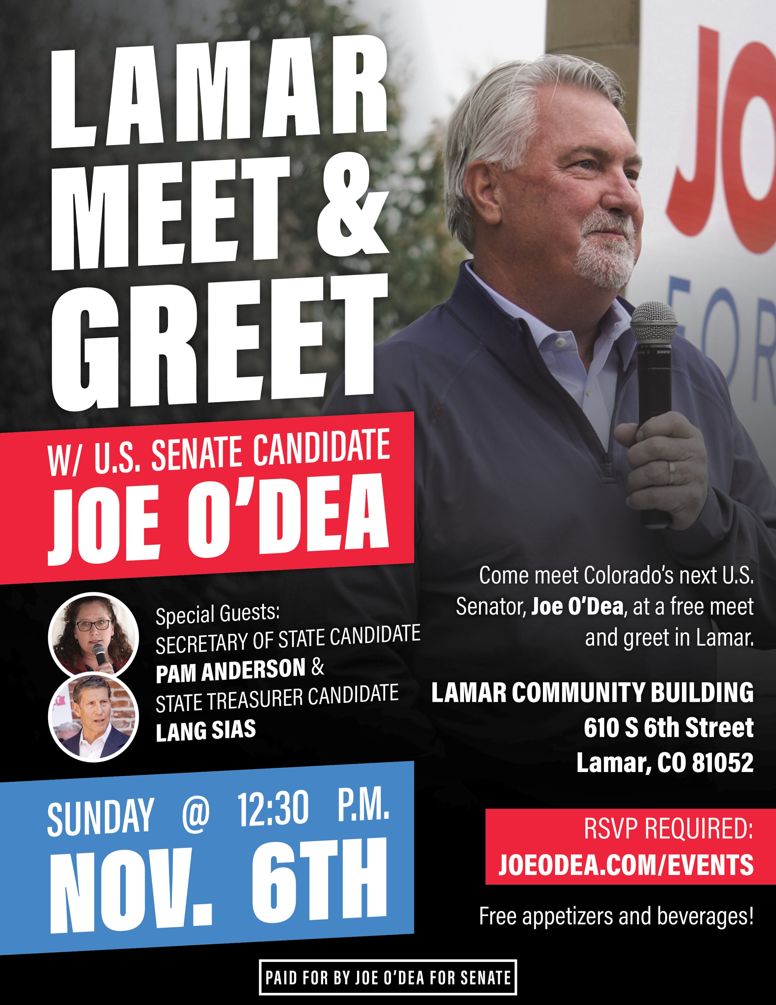 Come meet Colorado’s next U.S. Senator, Joe O’Dea, at a free meet and greet in Lamar. Special guests: Secretary of State candidate Pam Anderson and State Treasurer candidate Lang Sias.
