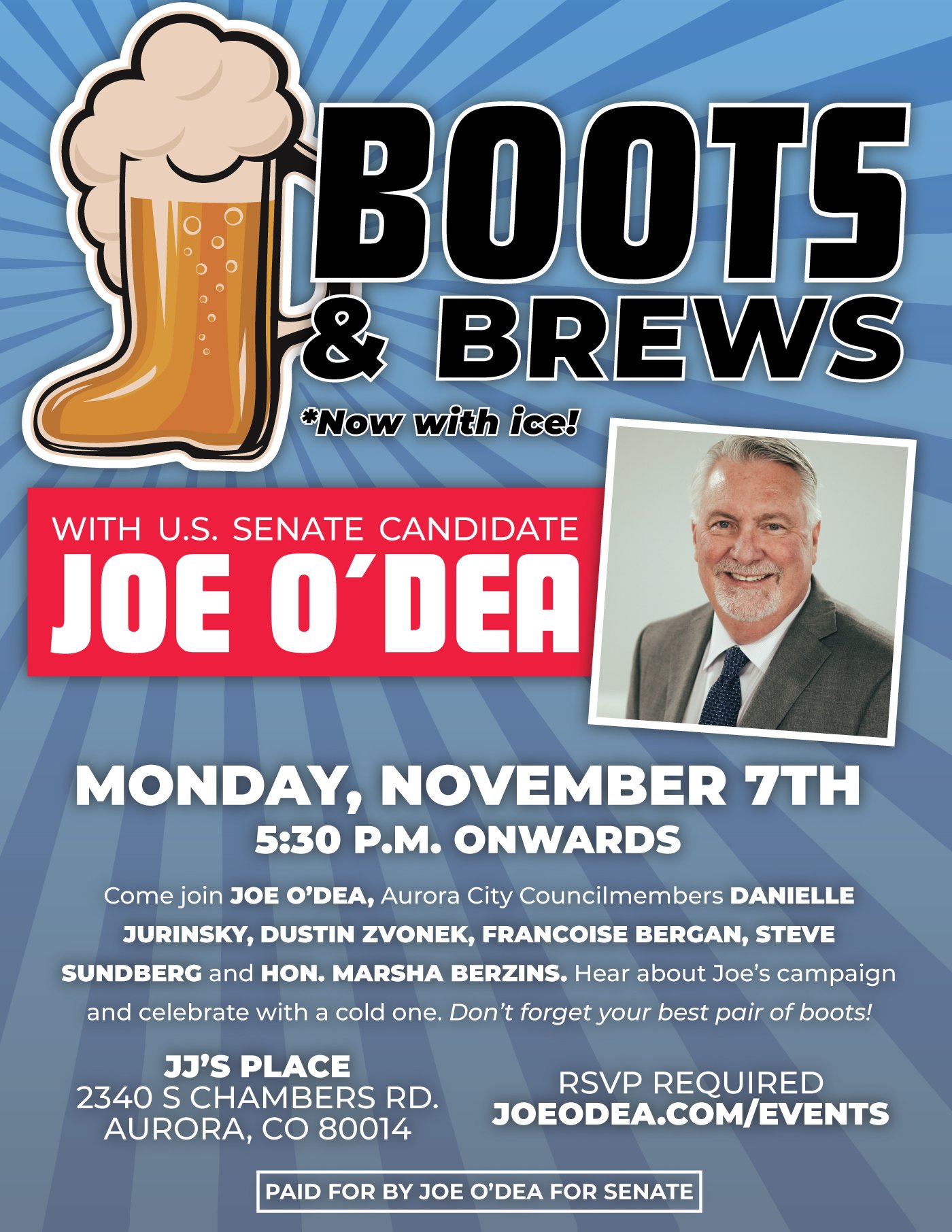 Come join Joe O’Dea, Aurora City Councilmember Danielle Jurinsky, and others for a free event. Hear about Joe’s campaign and celebrate with a cold one. Don’t forget your best pair of boots!